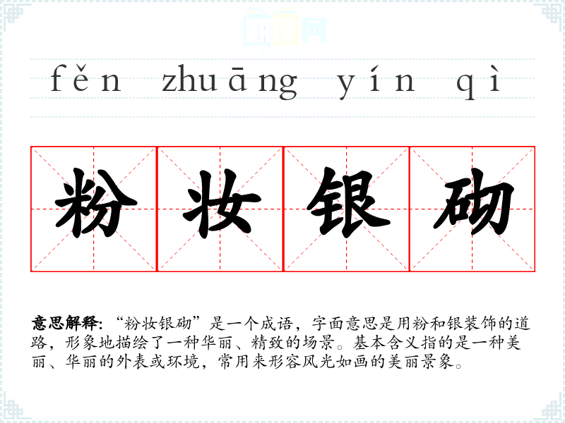 “粉妆银砌”出自古代文人对美丽景致的描写,具体的文学出处不易考证,但类似的表述在古典诗词中屡见不鲜。它反映了古代文人对自然美和人工美的追求,常用来形容山水风光、庭院景致等。