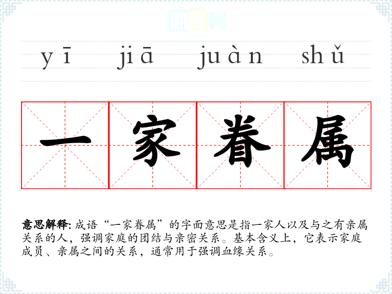 “一家眷属”并没有特定的历史典故或文学出处,它是由汉字组合而成的常用词语。在古代社会,家庭是社会的基本单位,家庭成员之间的关系被极为重视,因此产生了类似的表达。