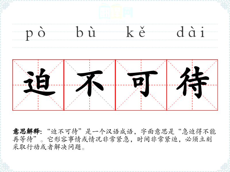 “迫不可待”是一个汉语成语,字面意思是“急迫得不能再等待”。它形容事情或情况非常紧急,时间非常紧迫,必须立刻采取行动或者解决问题。