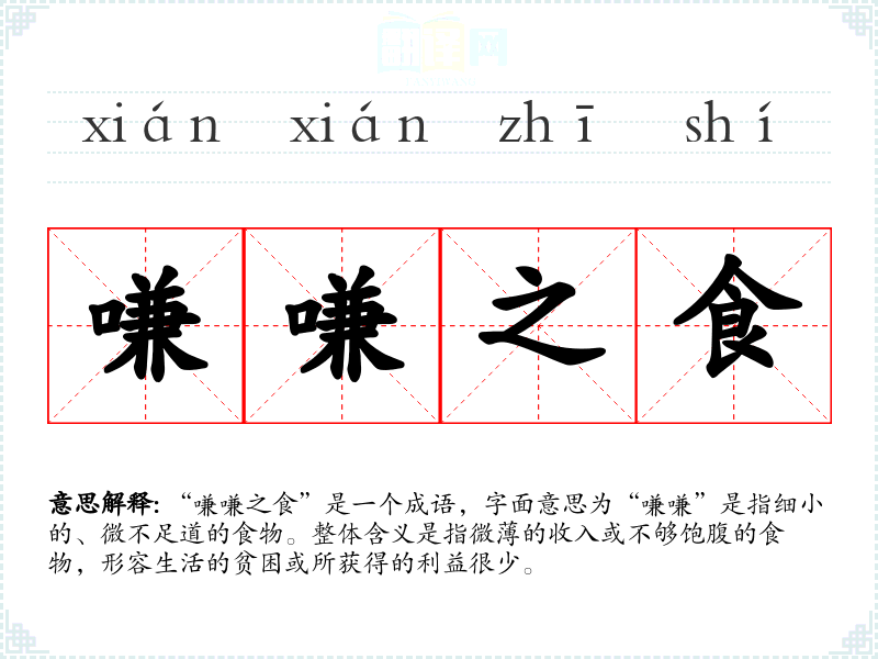 “嗛嗛之食”是一个成语,字面意思为“嗛嗛”是指细小的、微不足道的食物。整体含义是指微*的收入或不够饱腹的食物,形容生活的贫困或所获得的利益很少。