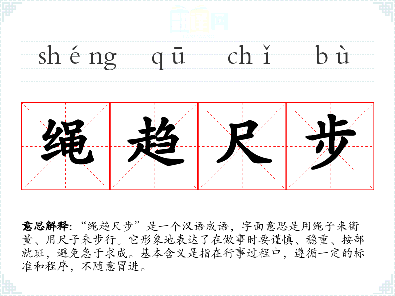 “绳趋尺步”是一个汉语成语,字面意思是用绳子来衡量、用尺子来步行。它形象地表达了在做事时要谨慎、稳重、按部就班,避免急于求成。基本含义是指在行事过程中,遵循一定的标准和程序,不随意冒进。
