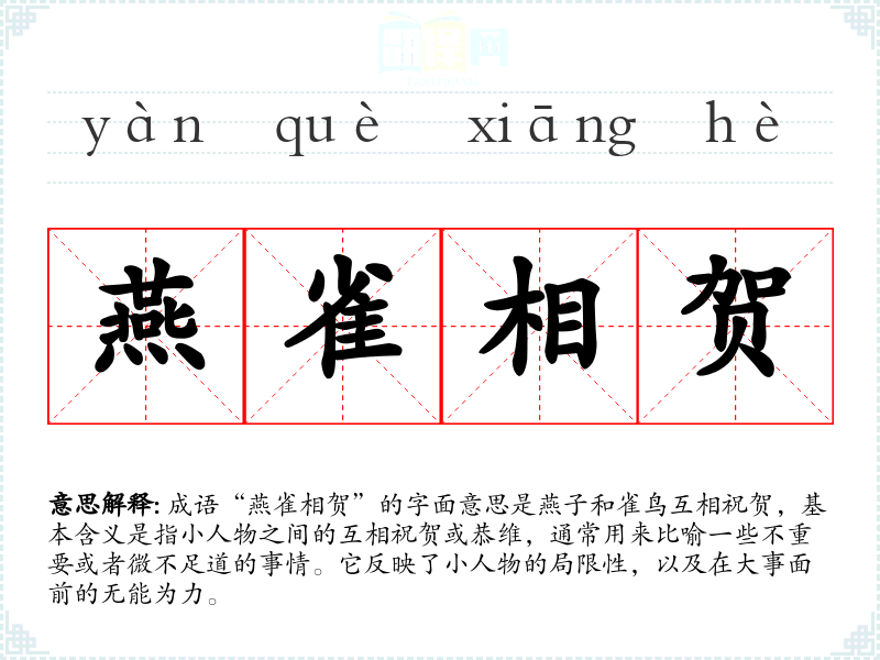 成语“燕雀相贺”的字面意思是燕子和雀鸟互相祝贺,基本含义是指小人物之间的互相祝贺或恭维,通常用来比喻一些不重要或者微不足道的事情。它反映了小人物的局限性,以及在大事面前的无能为力。