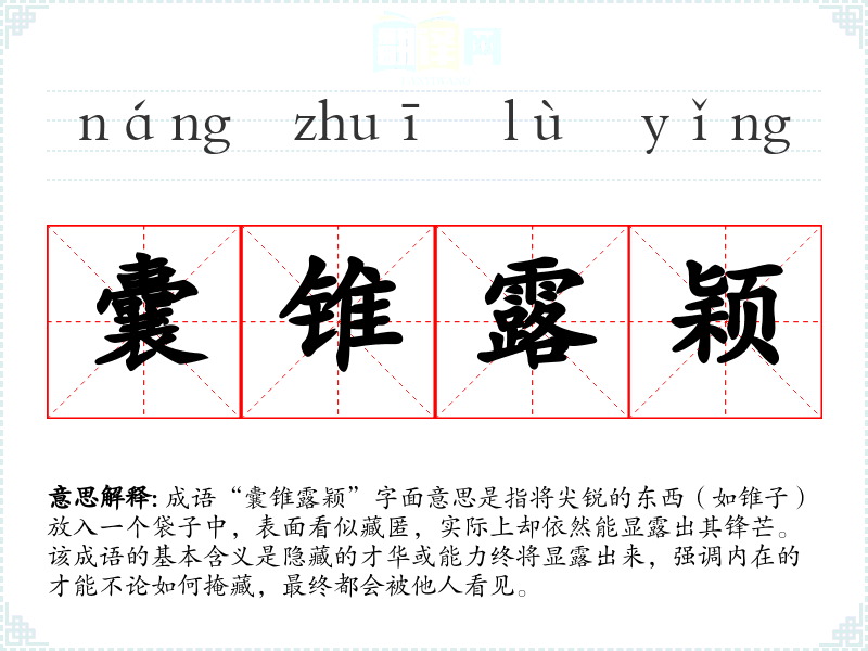 成语“囊锥露颖”字面意思是指将尖锐的东西(如锥子)放入一个袋子中,表面看似藏匿,实际上却依然能显露出其锋芒。该成语的基本含义是隐藏的才华或能力终将显露出来,强调内在的才能不论如何掩藏,最终都会被他人看见。