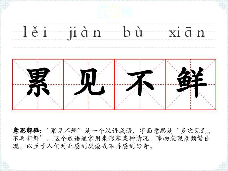 “累见不鲜”是一个汉语成语,字面意思是“多次见到,不再新鲜”。这个成语通常用来形容某种情况、事物或现象频繁出现,以至于人们对此感到厌倦或不再感到好奇。