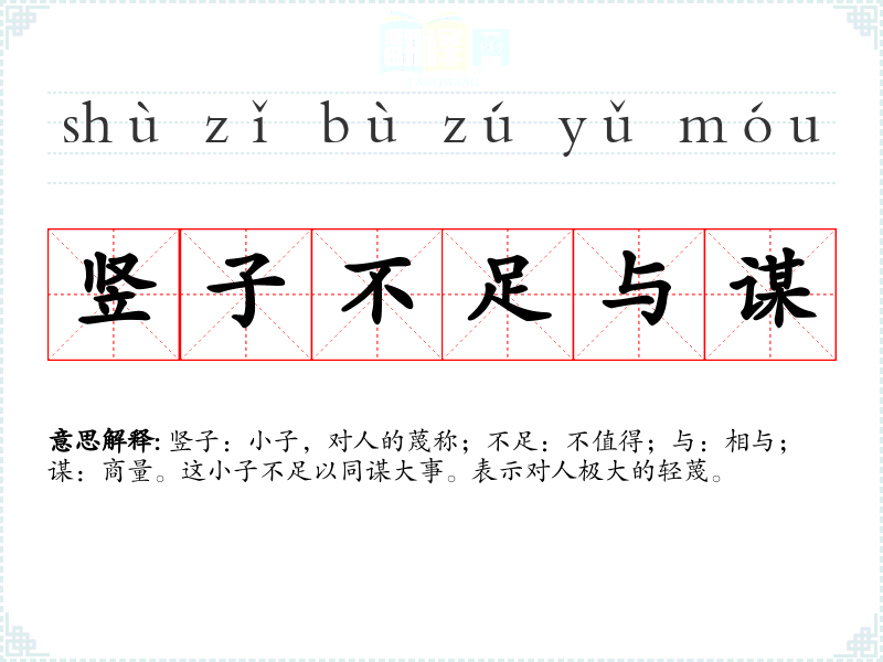 竖子:小子,对人的蔑称;不足:不值得;与:相与;谋:商量。这小子不足以同谋大事。表示对人极大的轻蔑。