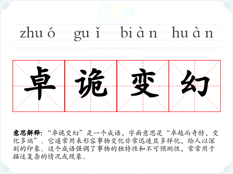 “卓诡变幻”是一个成语,字面意思是“卓越而奇特,变化多端”。它通常用来形容事物变化非常迅速且多样化,给人以深刻的印象。这个成语强调了事物的独特性和不可预测性,常常用于描述复杂的情况或现象。