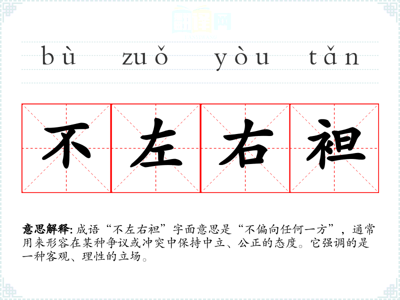 成语“不左右袒”字面意思是“不偏向任何一方”,通常用来形容在某种争议或冲突中保持中立、公正的态度。它强调的是一种客观、理性的立场。
