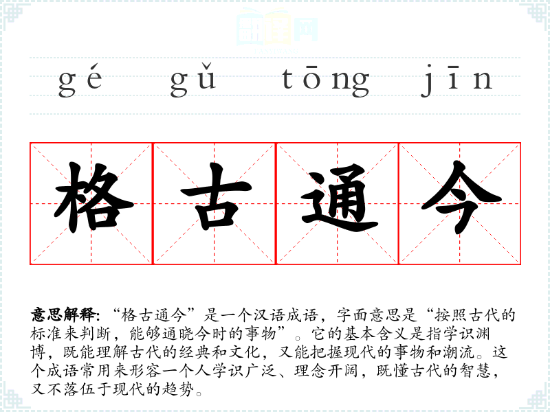 “格古通今”是一个汉语成语,字面意思是“按照古代的标准来判断,能够通晓今时的事物”。它的基本含义是指学识渊博,既能理解古代的经典和文化,又能把握现代的事物和潮流。这个成语常用来形容一个人学识广泛、理念开阔,既懂古代的智慧,又不落伍于现代的趋势。
