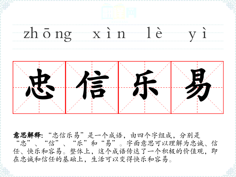 “忠信乐易”是一个成语,由四个字组成,分别是“忠”、“信”、“乐”和“易”。字面意思可以理解为忠诚、信任、快乐和容易。整体上,这个成语传达了一个积极的价值观,即在忠诚和信任的基础上,生活可以变得快乐和容易。