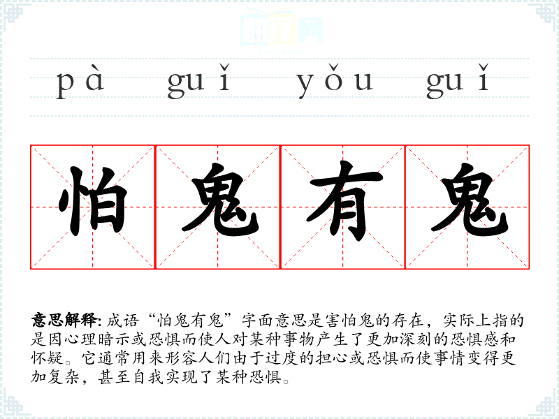 成语“怕鬼有鬼”字面意思是害怕鬼的存在,实际上指的是因心理暗示或恐惧而使人对某种事物产生了更加深刻的恐惧感和怀疑。它通常用来形容人们由于过度的担心或恐惧而使事情变得更加复杂,甚至自我实现了某种恐惧。