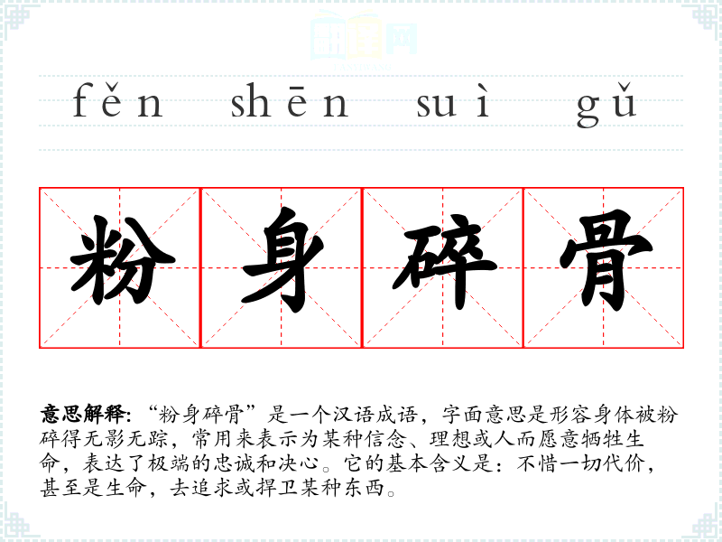 “粉身碎骨”是一个汉语成语,字面意思是形容身体被粉碎得无影无踪,常用来表示为某种信念、理想或人而愿意牺牲生命,表达了极端的忠诚和决心。它的基本含义是:不惜一切代价,甚至是生命,去追求或捍卫某种东西。
