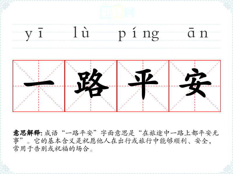 成语“一路平安”字面意思是“在旅途中一路上都平安无事”。它的基本含义是祝愿他人在出行或旅行中能够顺利、安全,常用于告别或祝福的场合。