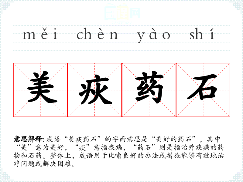 成语“美疢药石”的字面意思是“美好的药石”,其中“美”意为美好,“疢”意指疾病,“药石”则是指治疗疾病的药物和石药。整体上,成语用于比喻良好的办法或措施能够有效地治疗问题或解决困难。