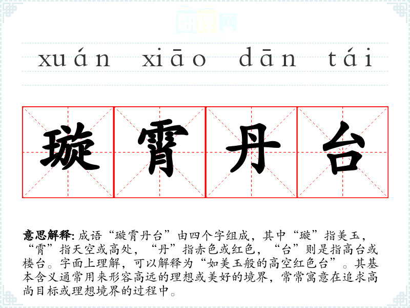 成语“璇霄丹台”由四个字组成,其中“璇”指美玉,“霄”指天空或高处,“丹”指赤色或红色,“台”则是指高台或楼台。字面上理解,可以解释为“如美玉般的高空红色台”。其基本含义通常用来形容高远的理想或美好的境界,常常寓意在追求高尚目标或理想境界的过程中。