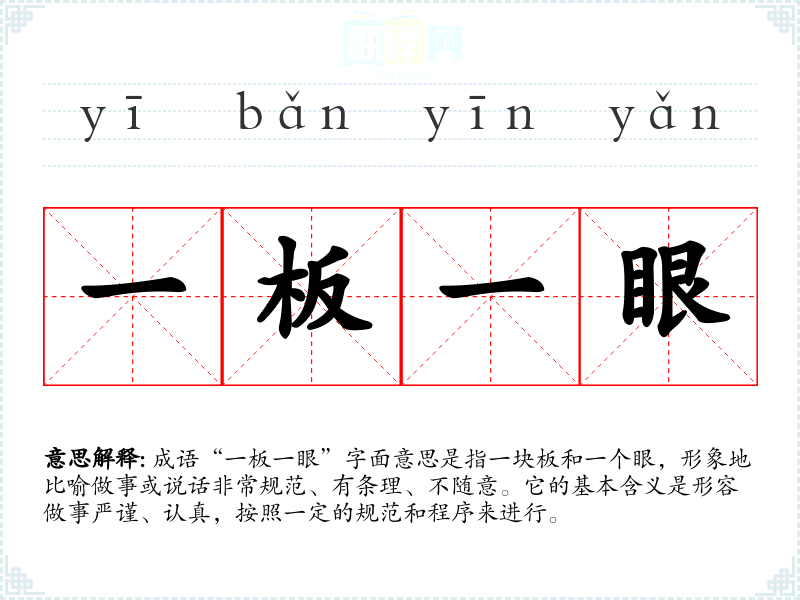 成语“一板一眼”字面意思是指一块板和一个眼,形象地比喻做事或说话非常规范、有条理、不随意。它的基本含义是形容做事严谨、认真,按照一定的规范和程序来进行。
