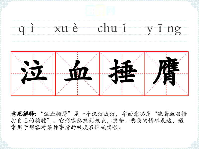 “泣血捶膺”是一个汉语成语,字面意思是“流着血泪捶打自己的胸膛”。它形容悲痛到极点,痛苦、悲伤的情感表达,通常用于形容对某种事情的极度哀悼或痛苦。