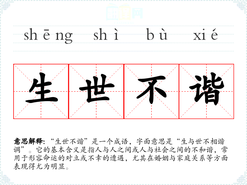 “生世不谐”是一个成语,字面意思是“生与世不相谐调”。它的基本含义是指人与人之间或人与社会之间的不和谐,常用于形容命运的对立或不幸的遭遇,尤其在婚姻与家庭关系等方面表现得尤为明显。