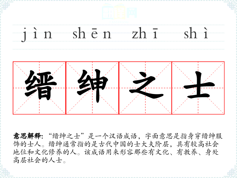“缙绅之士”是一个汉语成语,字面意思是指身穿缙绅服饰的士人。缙绅通常指的是古代**的士大夫阶层,具有较高社会地位和文化修养的人。该成语用来形容那些有文化、有教养、身处高层社会的人士。