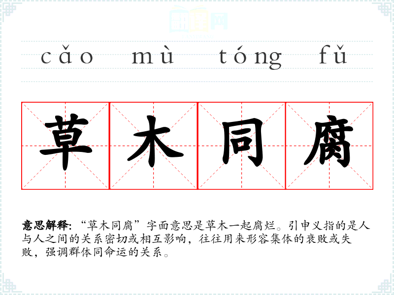 “草木同腐”字面意思是草木一起腐烂。引申义指的是人与人之间的关系密切或相互影响,往往用来形容集体的衰败或失败,强调群体同命运的关系。
