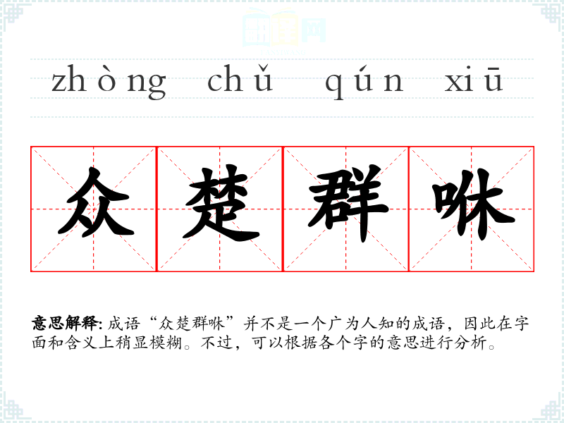成语“众楚群咻”并不是一个广为人知的成语,因此在字面和含义上稍显模糊。不过,可以根据各个字的意思进行分析。