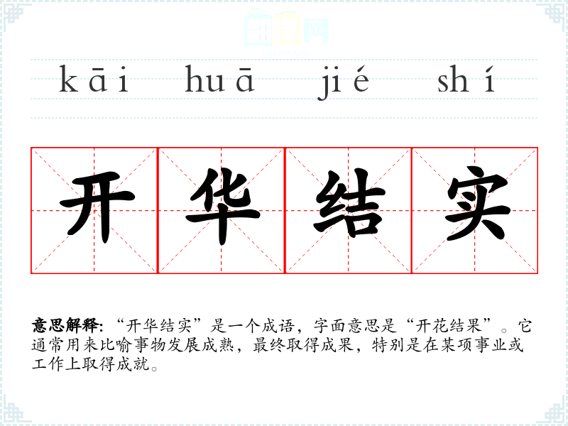 - 演讲:在演讲中,演讲者可以用此成语来强调团队努力后的成果,例如“我们的努力没有白费,终于开华结实,取得了理想的效果。”