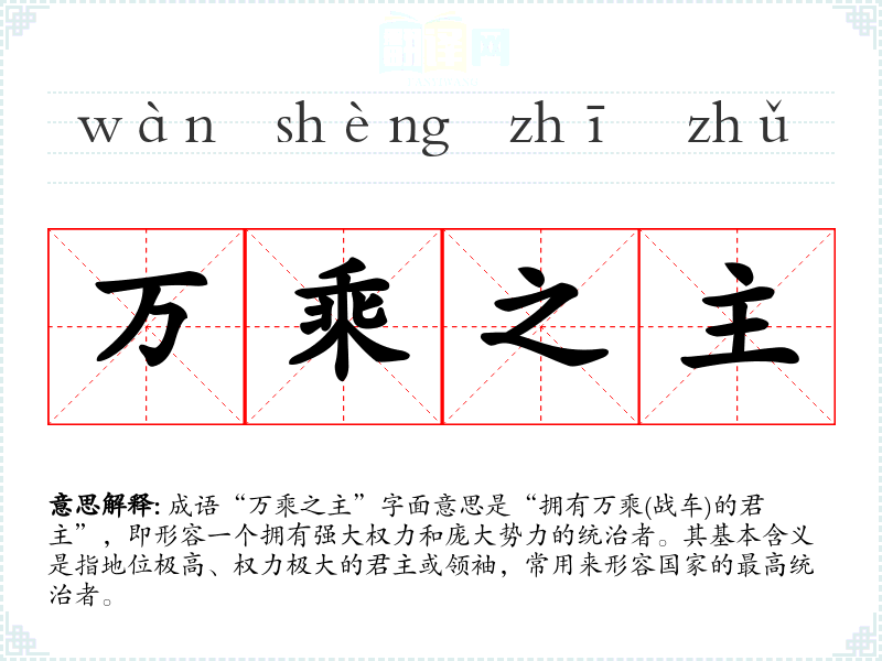 成语“万乘之主”字面意思是“拥有万乘(战车)的君主”,即形容一个拥有强大权力和庞大势力的统治者。其基本含义是指地位极高、权力极大的君主或领袖,常用来形容国家的最高统治者。