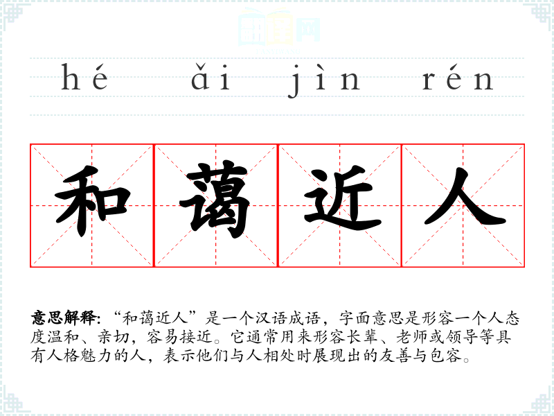 该成语的具体来源并无明确的历史典故,但“和蔼”本身指的是温和可亲,带有一种友善的态度;“近人”则表示容易接近,给人一种亲近感。合在一起,形成了对待他人时温暖和蔼的态度。成语的使用可以追溯到古代文学,尤其是在描写人际关系和性格特征的文献中。