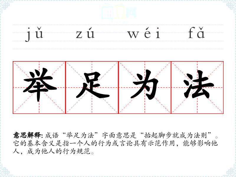 成语“举足为法”字面意思是“抬起脚步就成为法则”。它的基本含义是指一个人的行为或言论具有示范作用,能够影响他人,成为他人的行为规范。