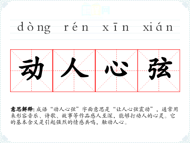 成语“动人心弦”字面意思是“让人心弦震动”,通常用来形容音乐、诗歌、故事等作品感人至深,能够打动人的心灵。它的基本含义是引起强烈的情感共鸣,触动人心。