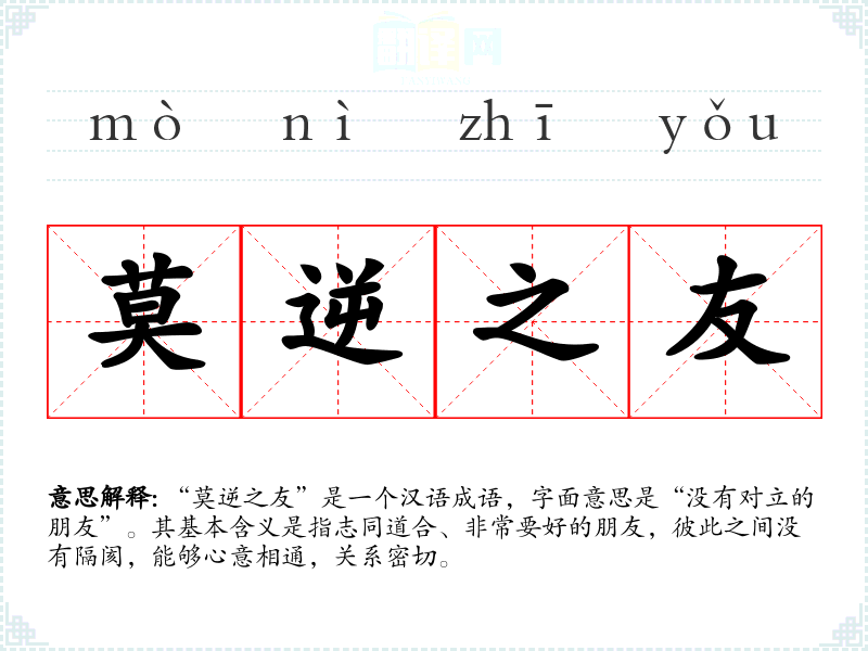 “莫逆之友”是一个汉语成语,字面意思是“没有对立的朋友”。其基本含义是指志同道合、非常要好的朋友,彼此之间没有隔阂,能够心意相通,关系密切。
