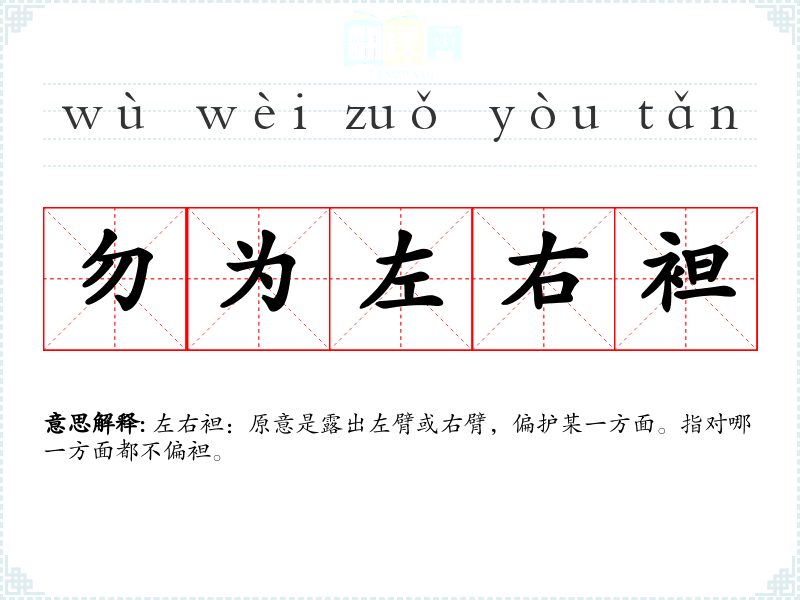 | 勿为左右袒 | 左右袒:原意是露出左臂或右臂,偏护某一方面。指对哪一方面都不偏袒。 |