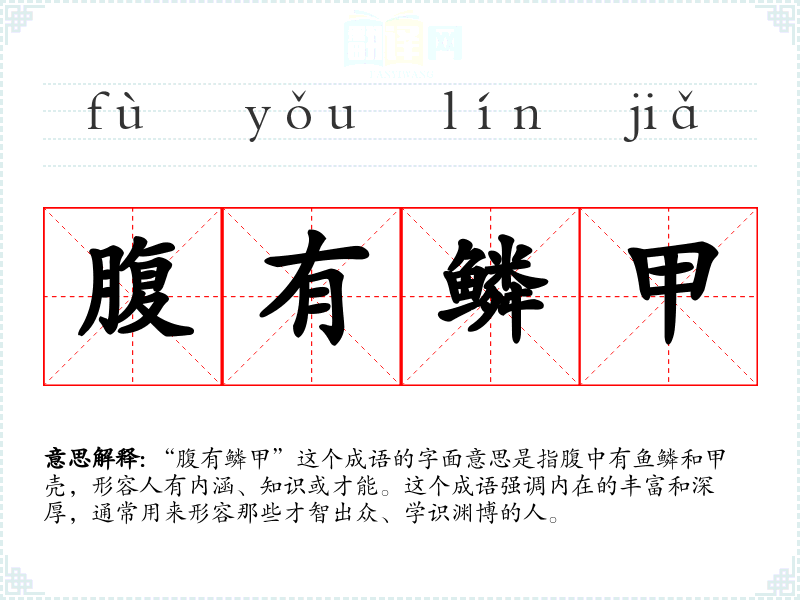“腹有鳞甲”这个成语的字面意思是指腹中有鱼鳞和甲壳,形容人有内涵、知识或才能。这个成语强调内在的丰富和深厚,通常用来形容那些才智出众、学识渊博的人。