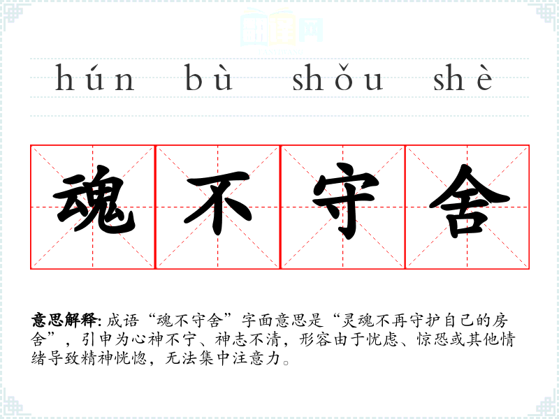 成语“魂不守舍”字面意思是“灵魂不再守护自己的房舍”,引申为心神不宁、神志不清,形容由于忧虑、惊恐或其他情绪导致精神恍惚,无法集中注意力。