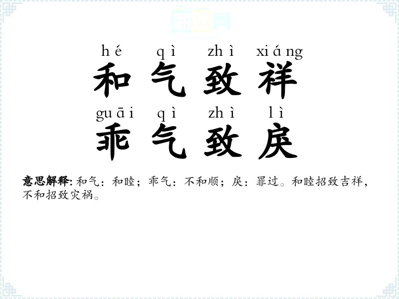 和气:温和的气象;致:招致;祥:吉祥;乖气:不和谐的气氛;戾:罪过。和睦融洽的气氛可致吉祥,不和谐的气氛则招致灾祸。 |