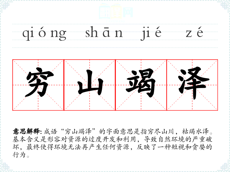 成语“穷山竭泽”的字面意思是指穷尽山川,枯竭水泽。基本含义是形容对资源的过度开发和利用,导致自然环境的严重破坏,最终使得环境无法再产生任何资源,反映了一种短视和贪婪的行为。