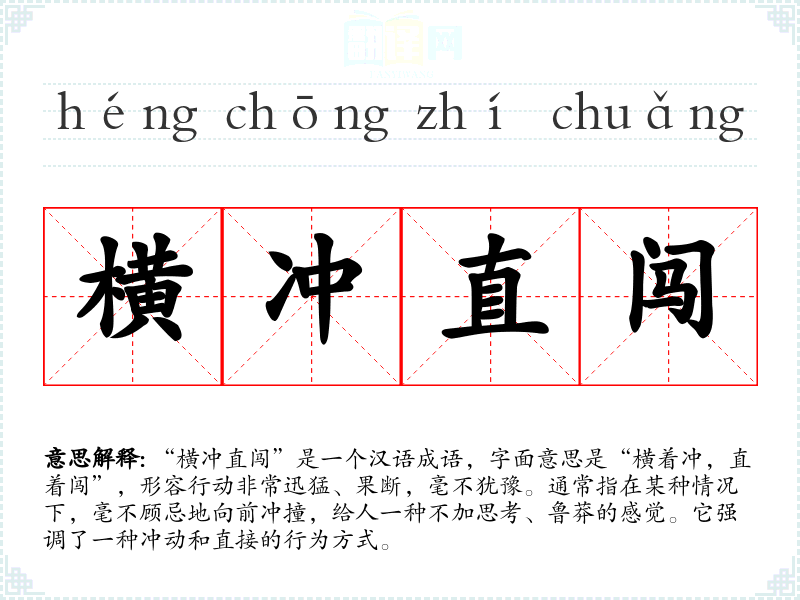 “横冲直闯”并没有明确的历史典故或文学出处,但其构成的字面意思和语义结构在汉语中是很常见的。它可能源于对冲撞和闯入行为的形象化描述,常用于形容那些在面对困难或障碍时,采取激烈、直接的方式去应对。