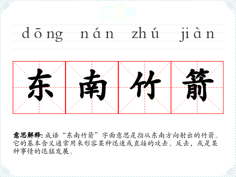 成语“东南竹箭”字面意思是指从东南方向射出的竹箭。它的基本含义通常用来形容某种迅速或直接的攻击、反击,或是某种事情的迅猛发展。