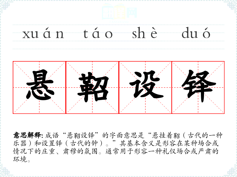 成语“悬鞀设铎”的字面意思是“悬挂着鞀(古代的一种乐器)和设置铎(古代的钟)。”其基本含义是形容在某种场合或情况下的庄重、肃穆的氛围。通常用于形容一种礼仪场合或严肃的环境。