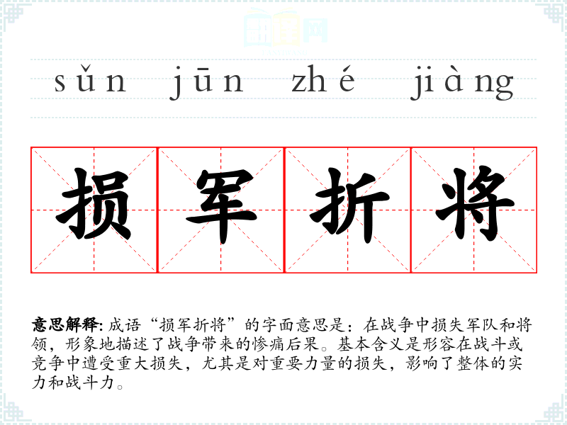 损军折将 犹损兵折将。兵士和将领都有损失。指作战失利。
