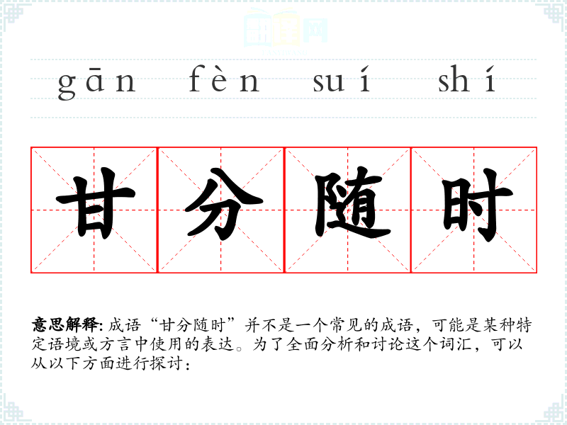 成语“甘分随时”并不是一个常见的成语,可能是某种特定语境或方言中使用的表达。为了全面分析和讨论这个词汇,可以从以下方面进行探讨: