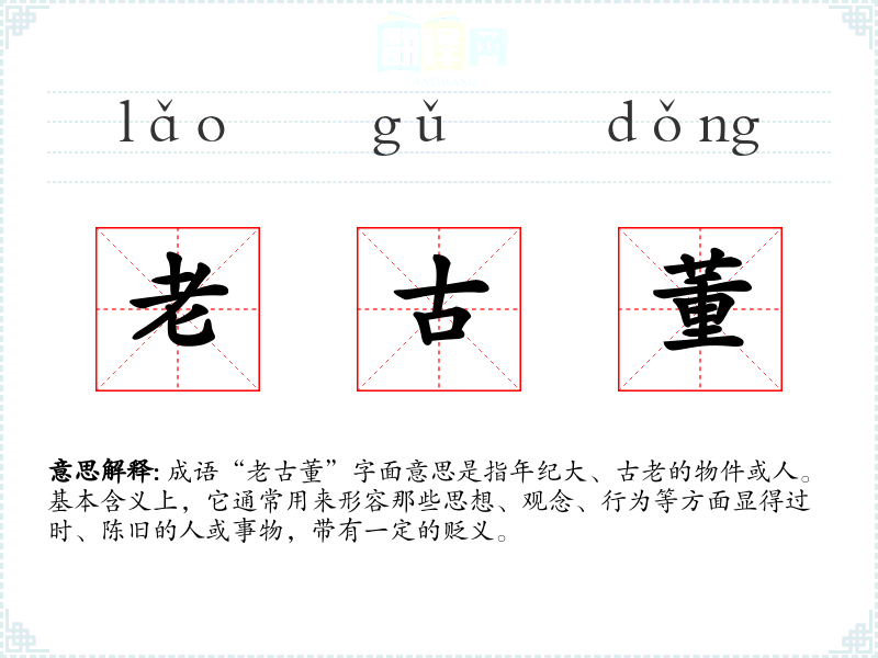 | 老古董 | 古老的或过时的东西,也指思想陈腐或生活习惯陈旧的人。 |
