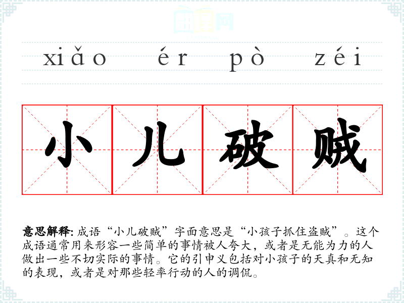 成语“小儿破贼”字面意思是“小孩子抓住盗贼”。这个成语通常用来形容一些简单的事情被人夸大,或者是无能为力的人做出一些不切实际的事情。它的引申义包括对小孩子的天真和无知的表现,或者是对那些轻率行动的人的调侃。