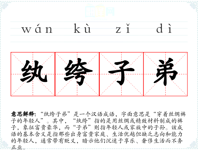 “纨绔子弟”是一个汉语成语,字面意思是“穿着丝绸裤子的年轻人”。其中,“纨绔”指的是用丝绸或精致材料制成的裤子,象征富贵豪华,而“子弟”则指年轻人或家族中的子孙。该成语的基本含义是指那些出身富贵家庭、生活优越但缺乏志向和能力的年轻人,通常带有贬义,暗示他们沉迷于享乐、奢侈生活而不务正业。