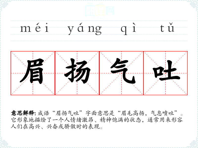 成语“眉扬气吐”字面意思是“眉毛高扬,气息喷吐”。它形象地描绘了一个人情绪激昂、精神饱满的状态,通常用来形容人们在高兴、兴奋或骄傲时的表现。