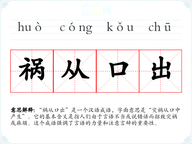 “祸从口出”是一个汉语成语,字面意思是“灾祸从口中产生”。它的基本含义是指人们由于言语不当或说错话而招致灾祸或麻烦。这个成语强调了言语的力量和注意言辞的重要性。