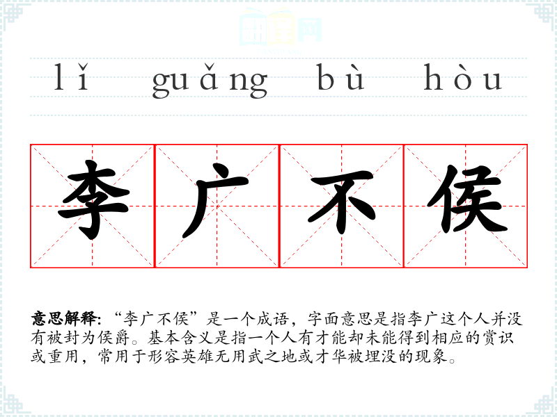 “李广不侯”是一个成语,字面意思是指李广这个人并没有被封为侯爵。基本含义是指一个人有才能却未能得到相应的赏识或重用,常用于形容英雄无用武之地或才华被埋没的现象。