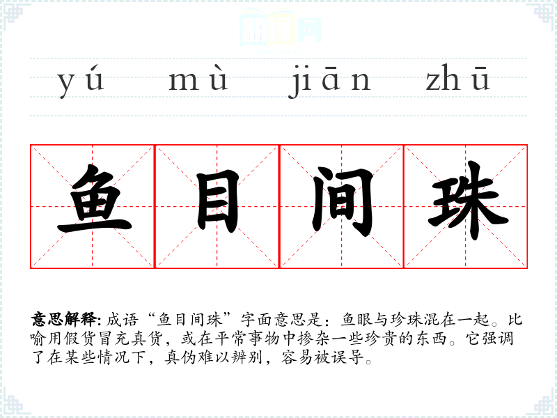 成语“鱼目间珠”字面意思是:鱼眼与珍珠混在一起。比喻用假货冒充真货,或在平常事物中掺杂一些珍贵的东西。它强调了在某些情况下,真伪难以辨别,容易被误导。