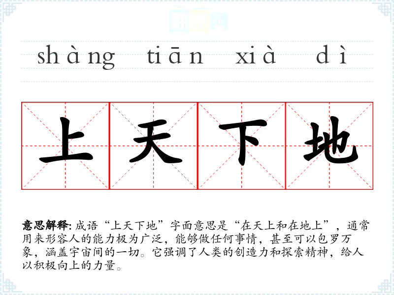 成语“上天下地”字面意思是“在天上和在地上”,通常用来形容人的能力极为广泛,能够做任何事情,甚至可以包罗万象,涵盖宇宙间的一切。它强调了人类的创造力和探索精神,给人以积极向上的力量。