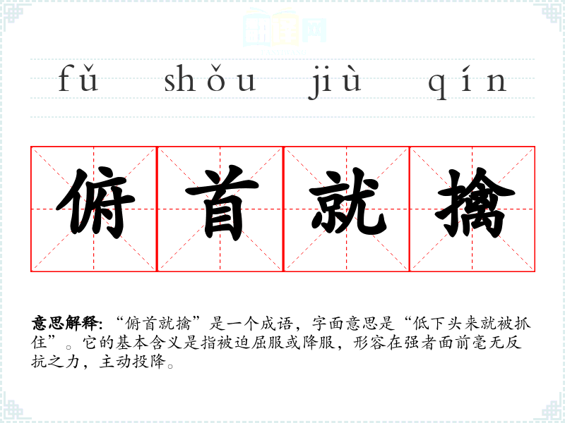 “俯首就擒”是一个成语,字面意思是“低下头来就被抓住”。它的基本含义是指被迫屈服或降服,形容在强者面前毫无反抗之力,主动投降。