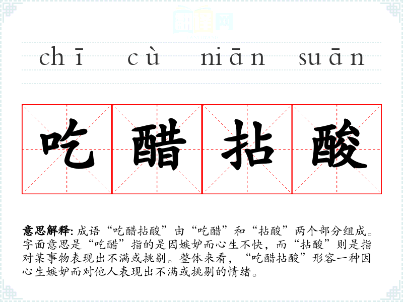 成语“吃醋拈酸”由“吃醋”和“拈酸”两个部分组成。字面意思是“吃醋”指的是因嫉妒而心生不快,而“拈酸”则是指对某事物表现出不满或挑剔。整体来看,“吃醋拈酸”形容一种因心生嫉妒而对他人表现出不满或挑剔的情绪。